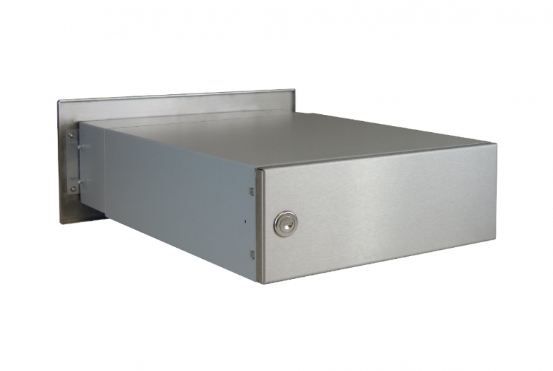 • 1x B-042 (300x110x390-630), schránka rovná s nastavitelnou hloubkou od 390 mm (předsazená dvířka) do 630 mm, čelní NEREZ deska ČD-2 s 1x zvonkovým tlačítkem (uchycení na 4 šrouby)