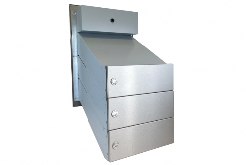• 3x D-041 (300x110x230-390) schránka šikmá s nastavitelnou hloubkou od 230 mm (předsazená dvířka) do 390 mm + horní elektro krabice (295x110x100)