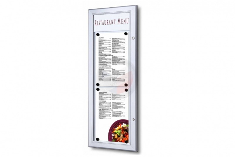 Elegantní menu vitrína 2xA4 na zeď je vhodná pro vnitřní nebo kryté venkovní použití. Obsah je ve vitríně chráněn díky speciálnímu zámku a nabídku i přesto snadno a rychle vyměníte. Horní část vitríny nabízí prostor pro umístění Vašeho loga.