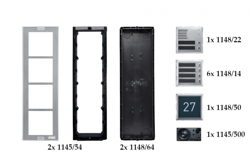Zvonkové tablo obsahuje: 2x instalační krabici (1145/54), 2x upevňovací a krycí rámeček (1148/64), 1x modul s prostorem pro hlasovou jednotku s 2 zvonkovými tlačítky (1148/22), 6x tlačítkový modul (1148/14), 1x modul pro jednu jmenovku nebo popisné číslo (1148/50) a 1x hlasovou jednotku (1145/500). Jednotlivé moduly jsou vyrobeny z eloxovaného hliníku.