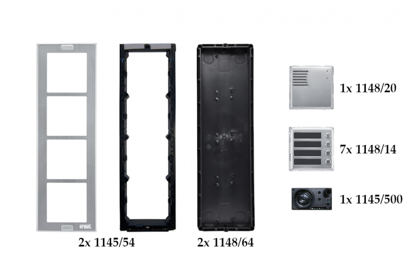 Zvonkové tablo obsahuje: 2x instalační krabici (1145/54), 2x upevňovací a krycí rámeček (1148/64), 1x modul s prostorem pro hlasovou jednotku (1148/20), 7x tlačítkový modul (1148/14) a 1x hlasovou jednotku (1145/500). Jednotlivé moduly jsou vyrobeny z eloxovaného hliníku.